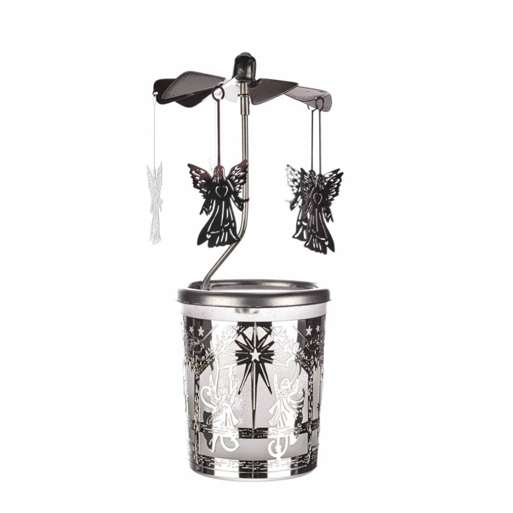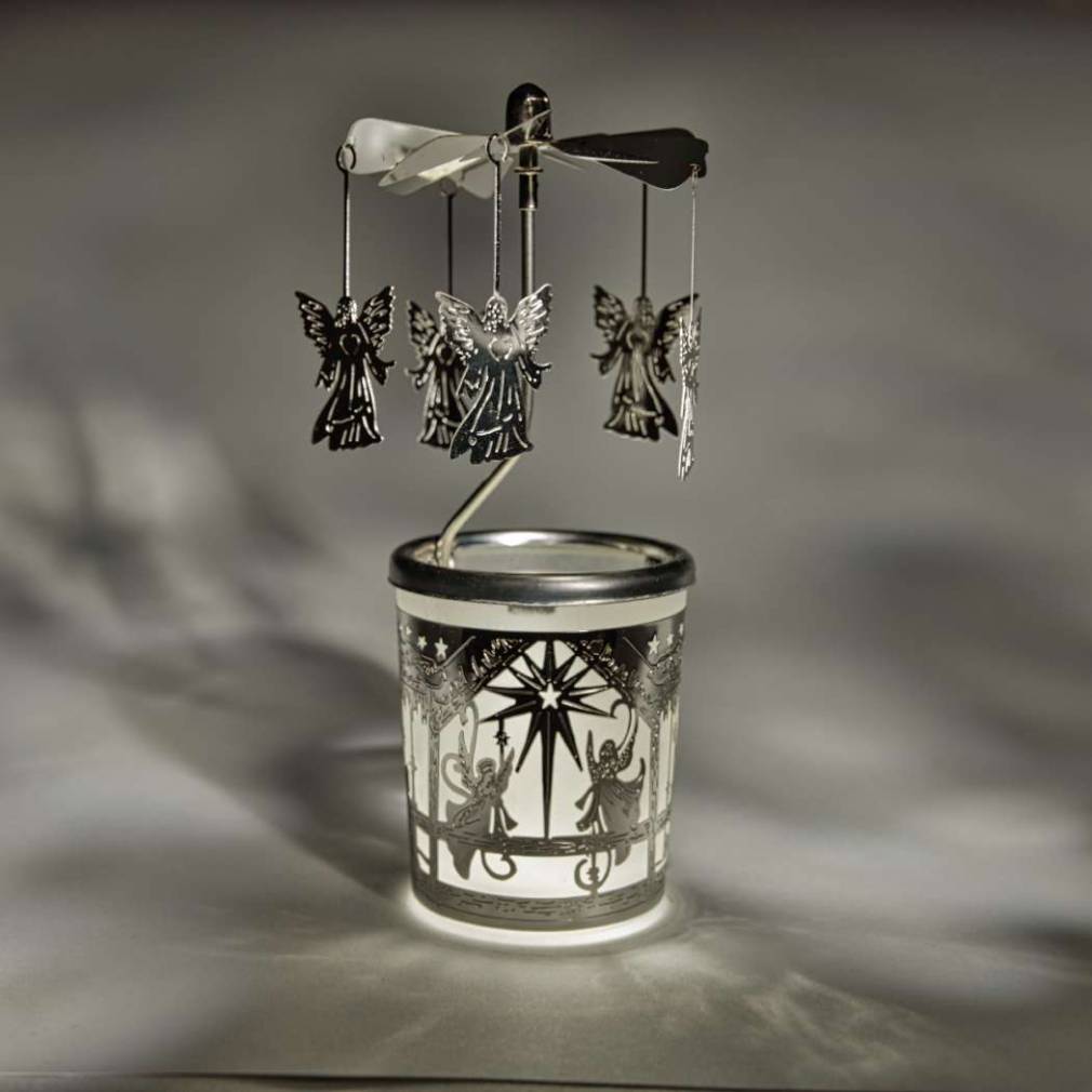 Magisches Lichtspiel: Das Herzstück ist das satinierte Glas (Milchglas), das durch die Wärme des Teelichts von innen sanft beleuchtet wird. Die aufsteigende Wärme versetzt den Rotor in Bewegung und lässt die 5 Anhänger im Kreis tanzen.