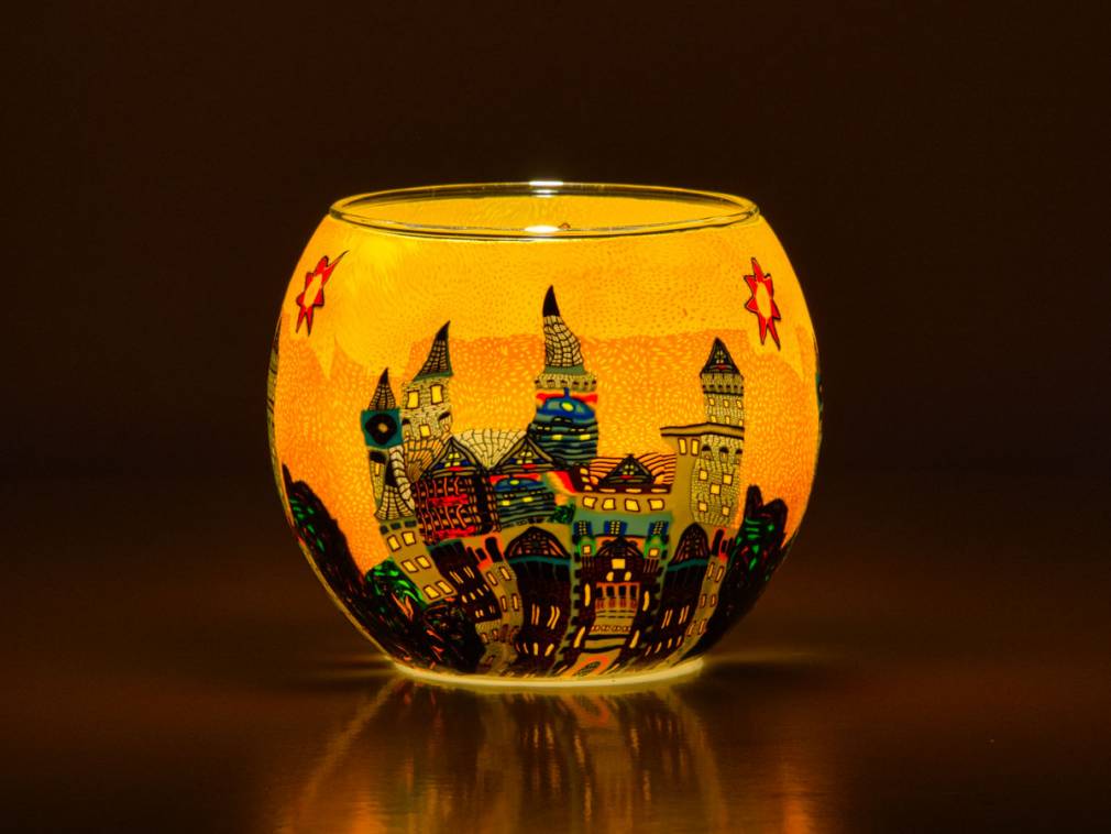 Bitte beachten Sie, dass die Leuchtgläser beim Fotografieren in Studioumgebung zur besseren Erkennung der Motive mit einer elektrischen Lampe beleuchtet wurden. Beim Beleuchten mit einem Teelicht, ist diese nicht ganz so hell, wirkt dafür lebendiger und verbreitet einen gemütliche Atmosphäre.
