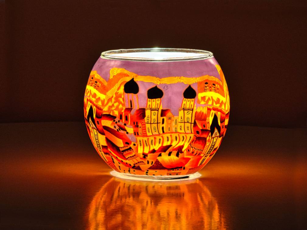 Bitte beachten Sie, dass die Leuchtgläser beim Fotografieren in Studioumgebung zur besseren Erkennung der Motive mit einer elektrischen Lampe beleuchtet wurden. Beim Beleuchten mit einem Teelicht, ist diese nicht ganz so hell, wirkt dafür lebendiger und verbreitet einen gemütliche Atmosphäre.