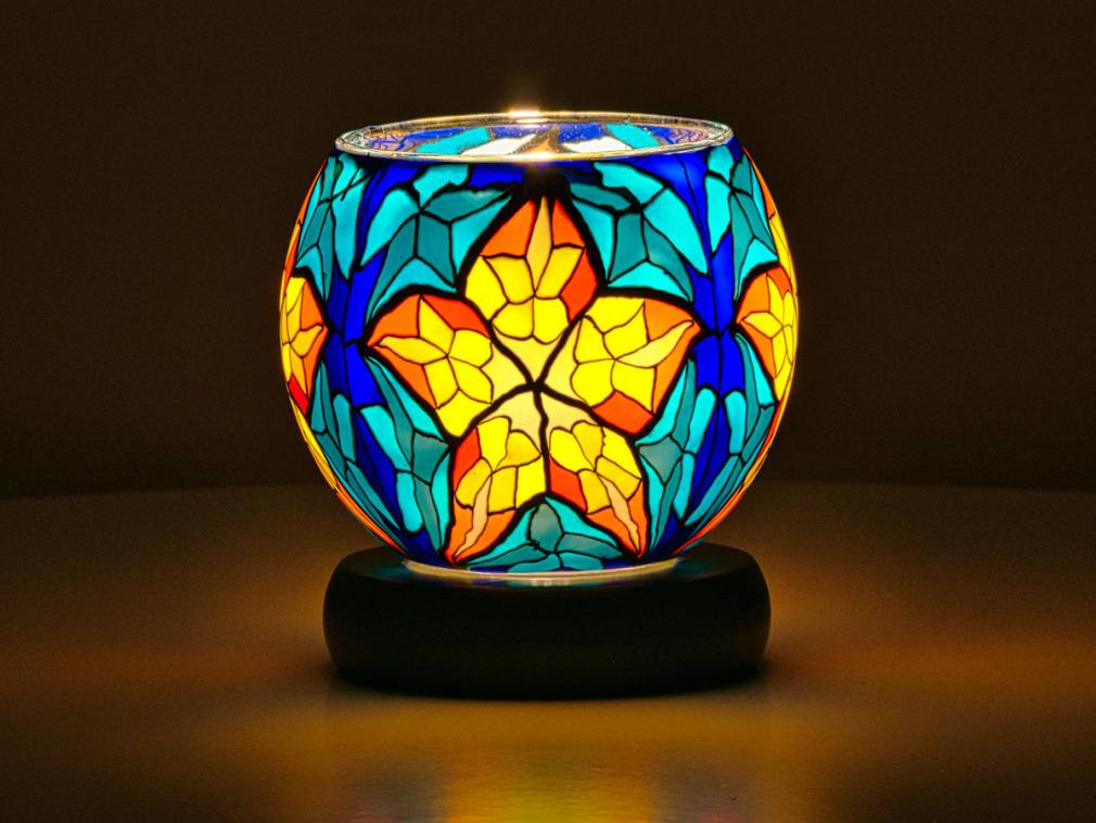 Die Motive der bunten und farbenfrohen Leuchtgläser werden per Handarbeit hergestellt und auf das Leuchtglas aufmodelliert.