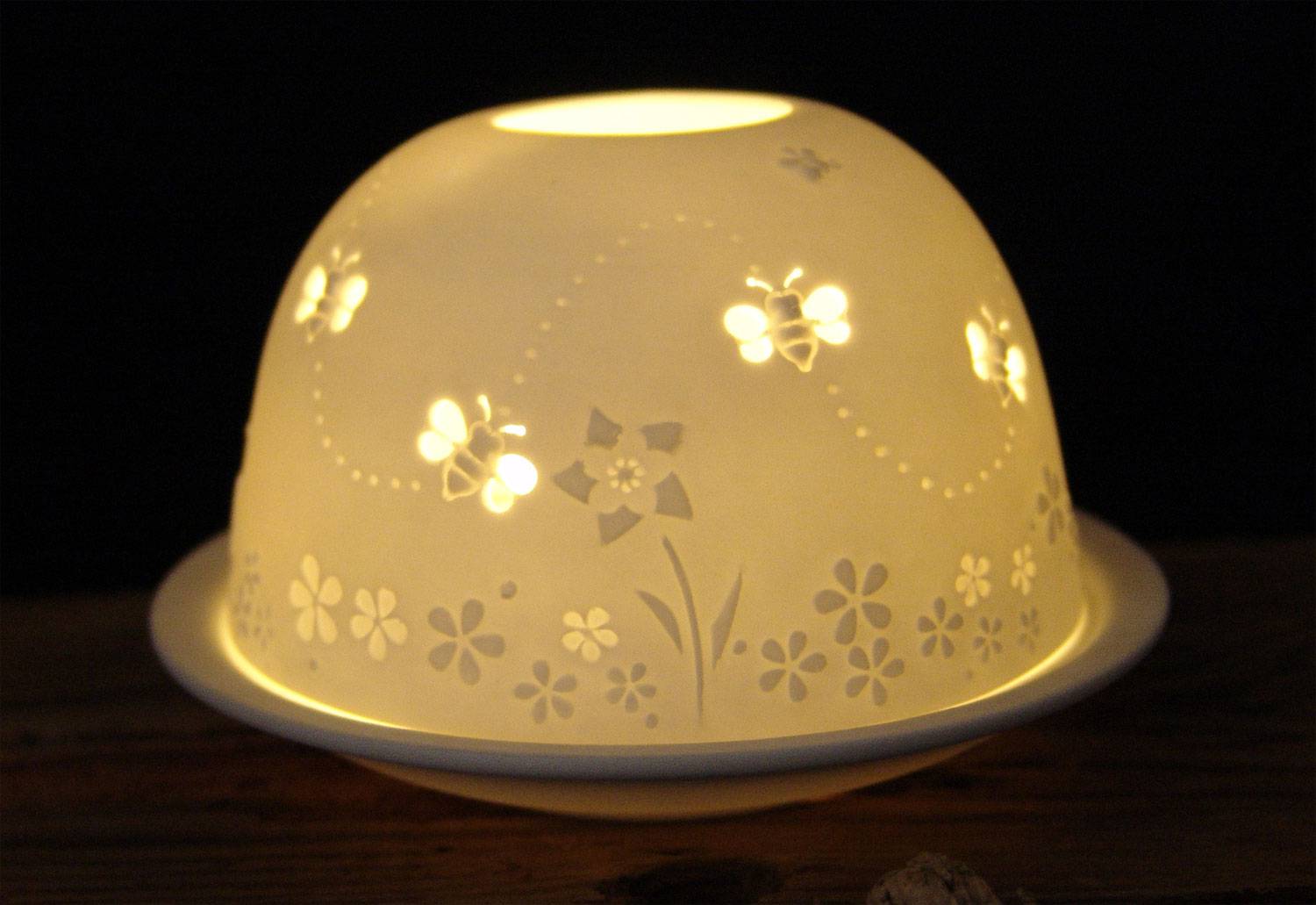 Starlight Nr.115 Bienen auf einer Sommerwiese, wobei die Bienen als Durchbrüche im feinen Porzellan dargestellt sind